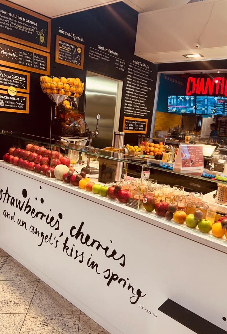 Seit vielen Jahren sind Paula und ich höchst zufriedene Stammgäste bei der FrischeBar. Die frisch gepressten Säfte in allen erdenklichen Zusammenstellungen, je nach Wunsch, stärken nicht nur das Immunsystem (wie z. B. der Ingwer-Zitrussaft, den ich mir regelmäßig hole), sie schmecken auch noch unglaublich lecker. Die fröhlichen Mädchen hinter der Ladentheke bereiten die Säfte mit sehr viel Liebe und Hingabe zu. Trotz hohem Aufwand in Bezug auf die Zubereitung, da alles immer frisch gemacht wird, muss man nicht allzu lange auf seine Bestellung warten.