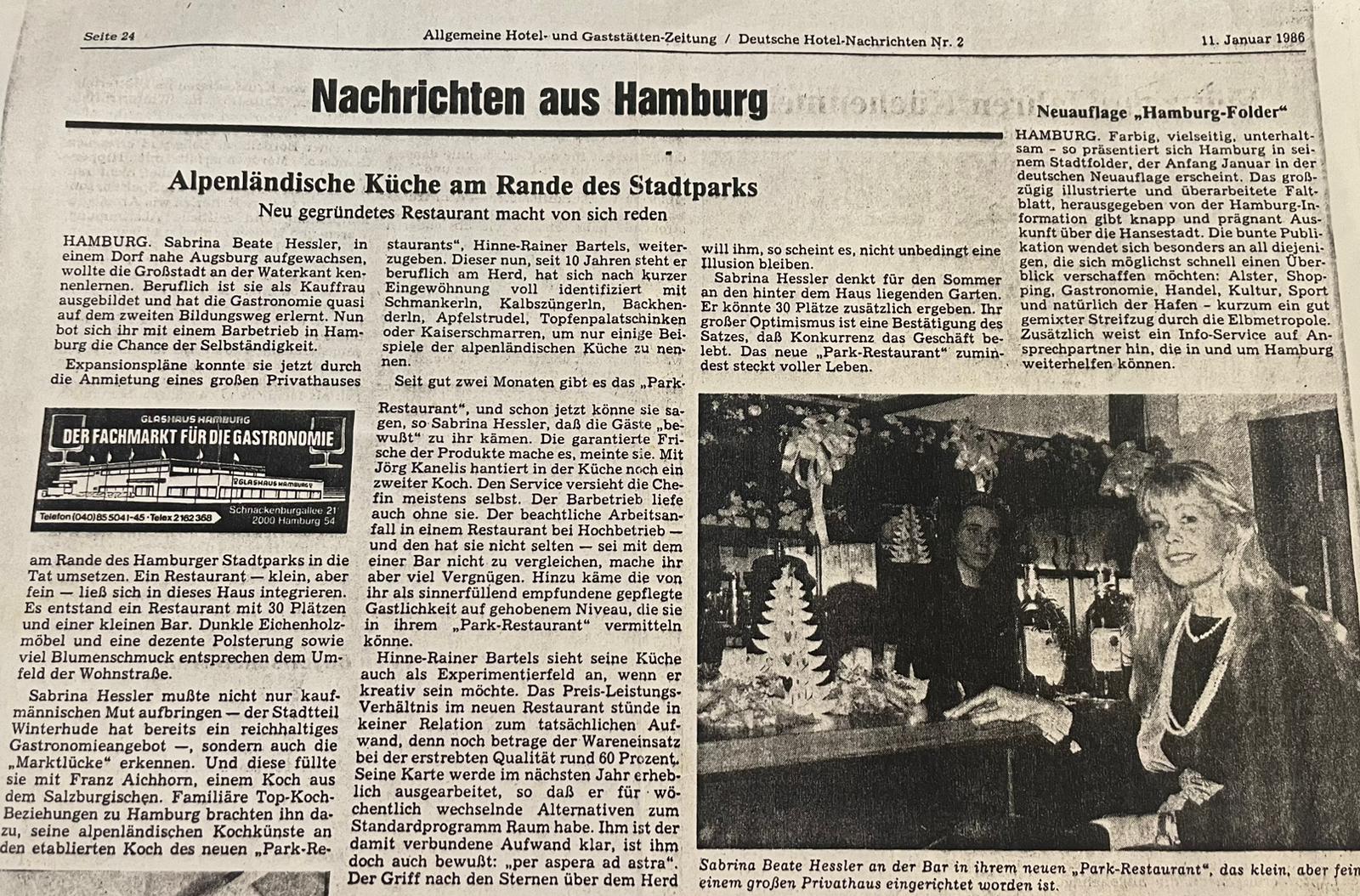 Nach langjähriger erfolgreicher Testung diverser hochkarätiger und beliebter „Locations“ und dadurch bekannt bei sämtlichen renommierten Restaurantbesitzern der Stadt, die auf mein Urteil vertrauten, hatte ich mich kurzerhand dazu entschieden, mein eigenes Restaurant zu eröffnen. Es war schön und ruhig gelegen am Rande des Stadtparks im Stadtteil Winterhude. (siehe Zeitungsartikel v. 1986)