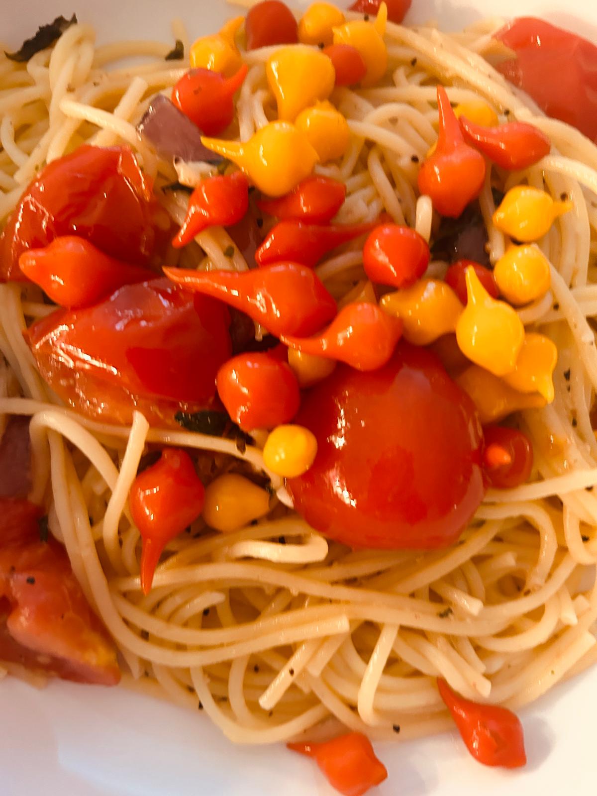 - Gib dann die gekochten Nudeln dazu und garniere es mit Chili Öl, sowie frischer gelber und roter Paprika